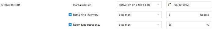 An example: The assignment will be activated on 10.06.2022 if the remaining room availability is less than 5 rooms and the occupancy of the room category is less than 85%