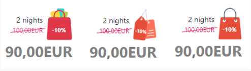Go to the Booking Engine menu and click on Overview. Choose the booking engine you wish to customize the display for, and scroll down to the “Circle configuration” section. Within this section, locate the “Price display” option, where you can pick the preferred discount presentation. Decide between the traditional red background with a percentage display or select one of the three available icons. For a more personalized touch, your web agencies have the flexibility to customize the icons using custom CSS!
