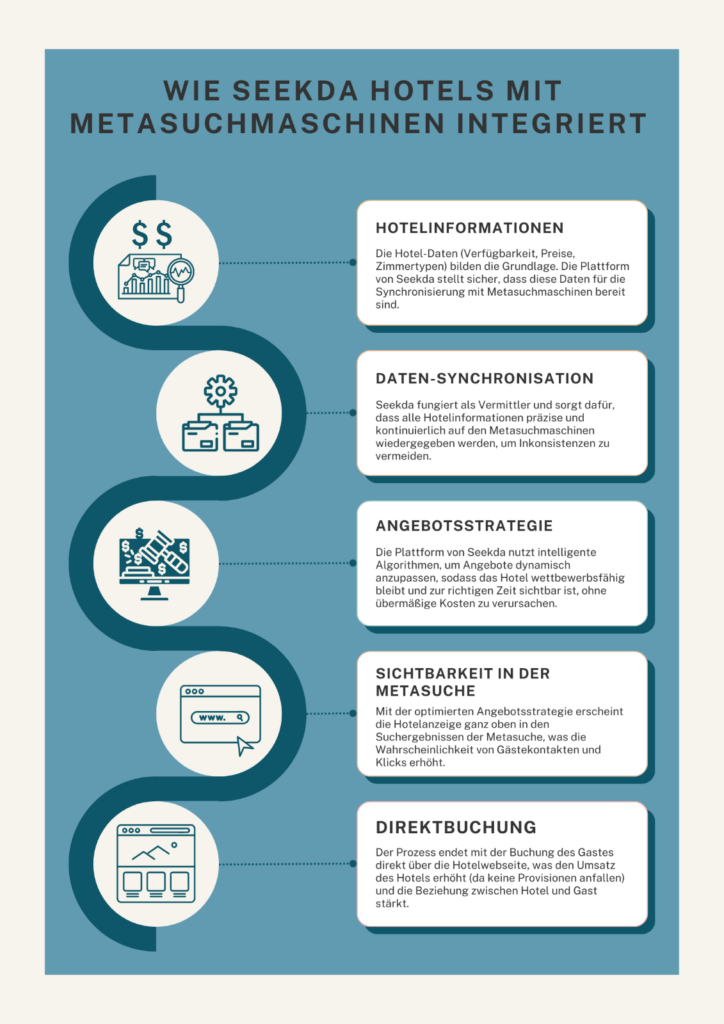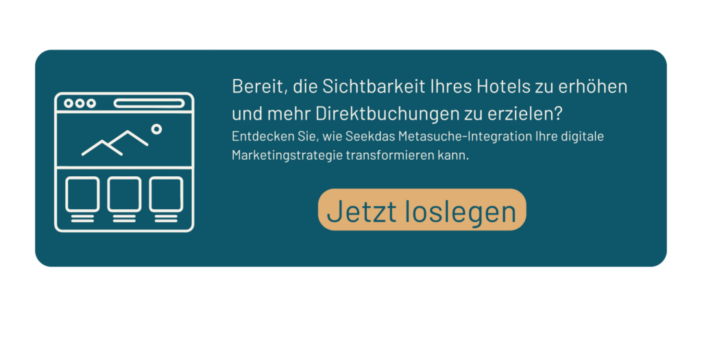 Metasuchmaschinen sind ein entscheidender Kanal, um Direktbuchungen zu fördern, die für Hotels profitabler sind als Buchungen über OTAs. Durch die Integration mit Seekdas Lösungen können Hotels sicherstellen, dass ihre Direktbuchungsoptionen in den Suchergebnissen der Metasuche gut sichtbar sind und Reisende ermutigen, direkt über die Hotelwebseite zu buchen. Dies reduziert die an OTAs gezahlten Provisionen und stärkt die Beziehung des Hotels zu seinen Gästen.