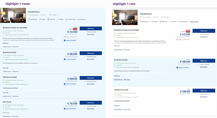 - Mit Hotel Bonus können Sie nun Raten auswählen, die Sie hervorheben möchten, um Ihren Umsatz zu steigern. Wenn Sie diese Funktion nutzen, wird Ihre KUBE die Aufmerksamkeit der Nutzer für die ausgewählten Angebote erhöhen. Wenn nur eine Rate pro Zimmertyp mit Hotel Bonus-Prämien angeboten wird oder wenn ein ganzes Zimmer mit allen Raten Prämien bietet, werden die hervorgehobenen Angebote mit einer anpassbaren Hintergrundfarbe hervorgehoben und in einem leicht veränderten Layout angezeigt.