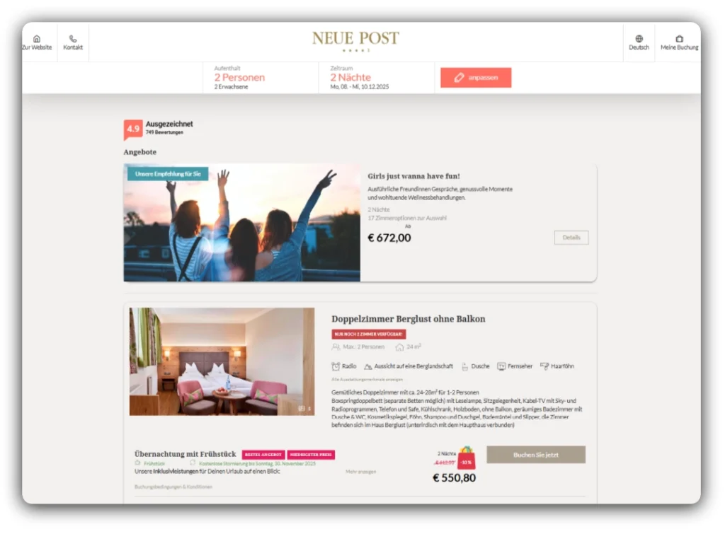 Der Gast vergleicht, klickt auf „Direkt buchen“ und schließt die Reservierung in Sekunden ab.
