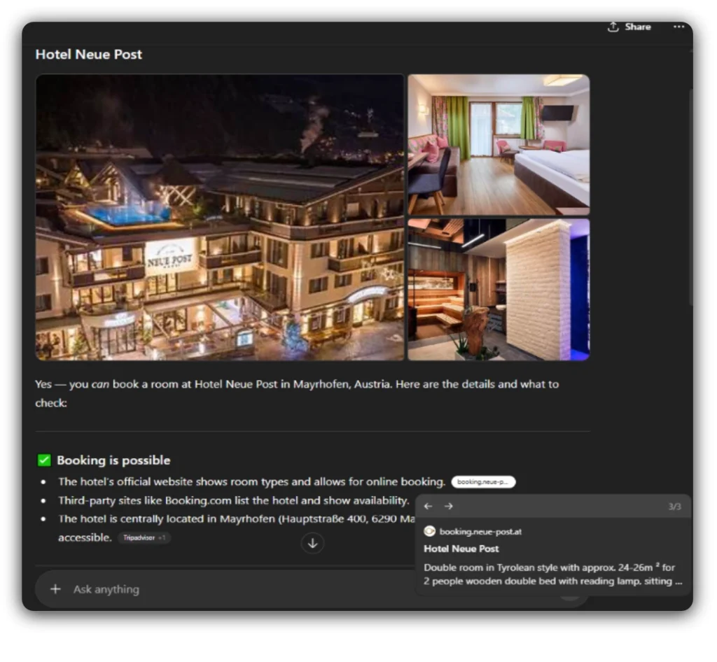 Innerhalb weniger Sekunden liefern diese Systeme strukturierte Hotelinformationen – mit Fotos, Bewertungen, Preisen und Links zu Buchungsseiten. Im Hintergrund greifen sie auf Google Hotels, Tripadvisor und andere Metasuch-Plattformen zu.