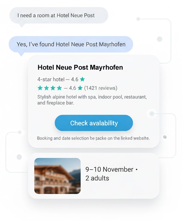 Gäste müssen nicht mehr dutzende Tabs öffnen – sie fragen einfach und buchen direkt.
