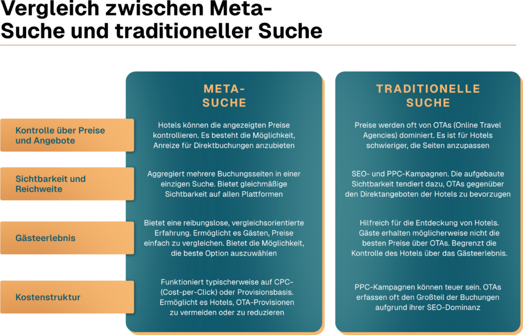• Meta-Suche: Hotels haben die Kontrolle über die angezeigten Preise auf Meta-Suchmaschinen, sodass sie direkt mit OTAs konkurrieren und Anreize für Direktbuchungen anbieten können.